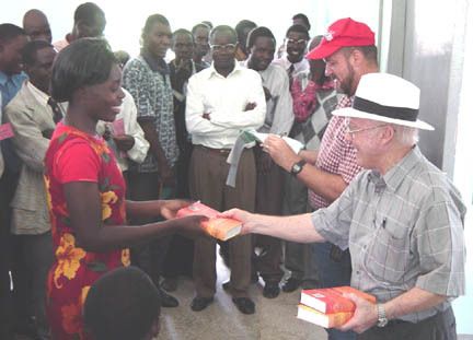 While funds were collected for renovation, another project was spearheaded by the Quaker Avenue Church and coordinated by Carey Jones, to collect at least 6,000 books for a library. It was later learned that for national certification at college level, at least 10,000 volumes were needed. Carey put out a call for book donations and on June 26, 2004, a crew from the Quaker Avenue Church assembled at the shipping container that had been delivered to Lubbock, and by early afternoon had loaded approximately 14,000 volumes. The loaded container was then carried by semi-truck to Houston and put on a ship for Uganda. The collection included a broad selection of theological works with a complement of history and children's books. Also on board were some appliances for the missionaries and about 1500 pairs of glasses to be used by George and Diane Franklin of Clovis, New Mexico who had planned to conduct another of their very successful eye clinics among the churches in Uganda and Kenya.
